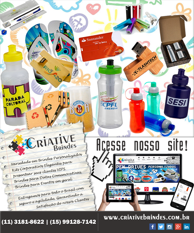 A Criative Brindes trabalha com Agilidade e Eficiência focando o Excelente Atendimento aos nossos clientes. Buscamos satisfazê-lo desde sua visita em nosso site até o pós-compra, com nosso atendimento SAC, coletando informações e sujestões para aprimorarmos cada vez mais! Tratamos igualmente as Empresas de Grandes e Pequenos portes, e pessoas físicas,oferecendo variedades e facilidade no processo de compra em busca de Fidelizar cada cliente.