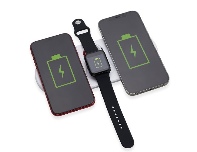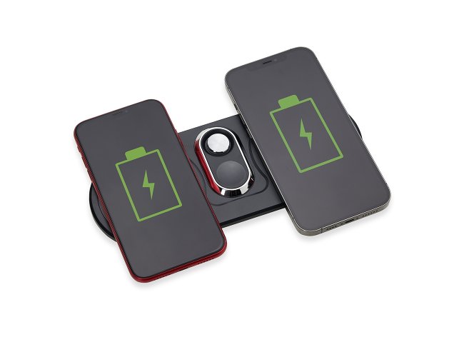 Base de carregamento por indução dual para celulares e Iwatch. Com “almofadas” de indução para o carregamento de celulares simultaneamente, a base contém na área central uma área indutiva para o carregamento de Iwatch com luzes leds indicativas de funcionamento. Para maior estabilidade em superfícies, a base possui borrachas antideslizantes na área inferior. Acompanha cabo USB Tipo-C.