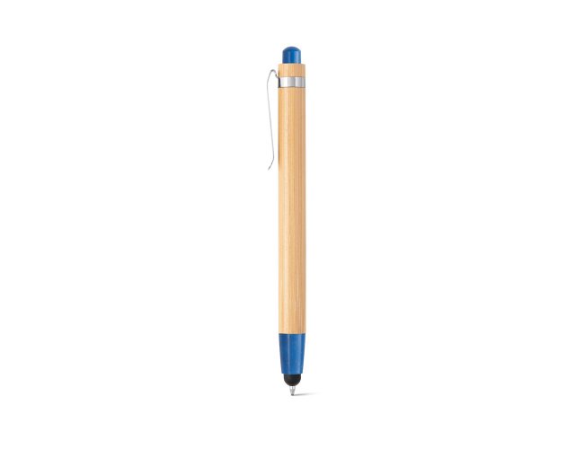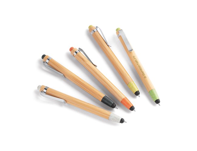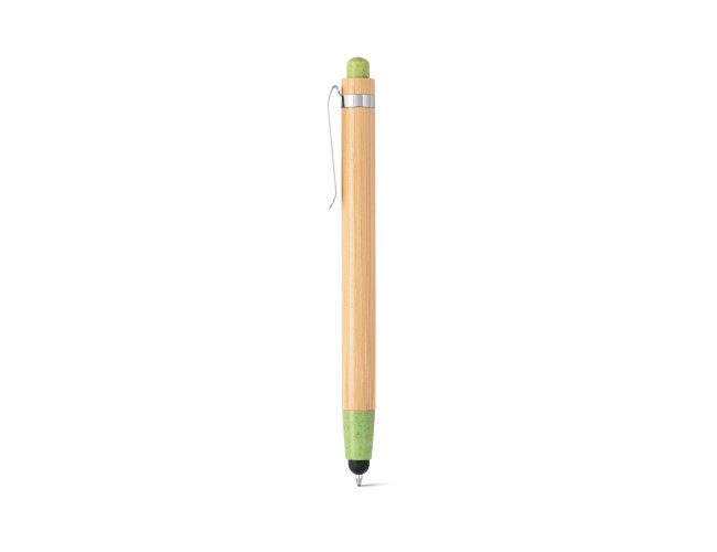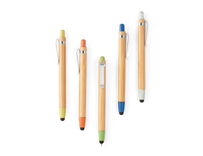 Esferográfica em bambu com ponteira touch e clipe em metal. Os elementos coloridos são em fibra de trigo e ABS. Até 1,5 km de escrita. ø11 x 139 mm