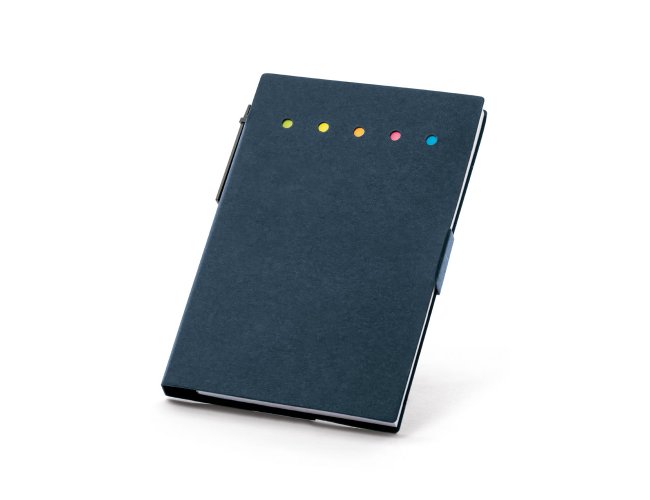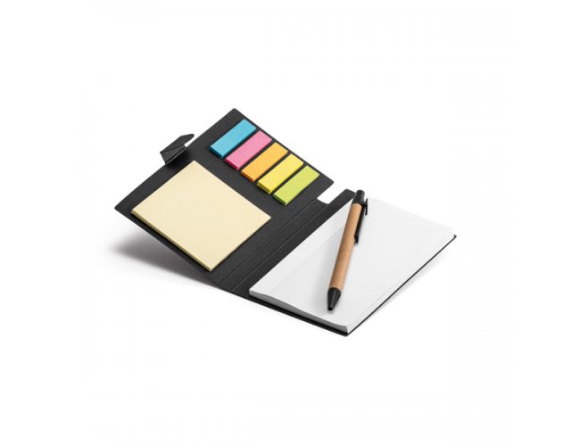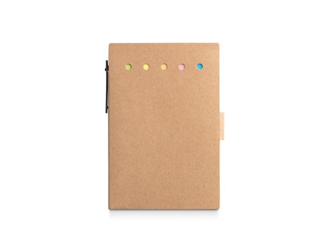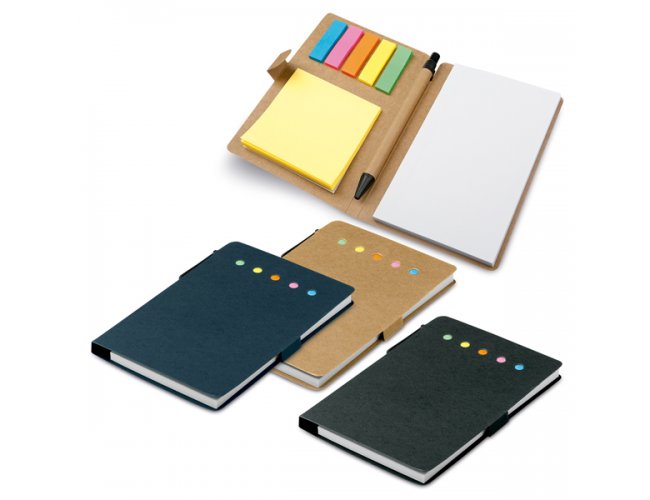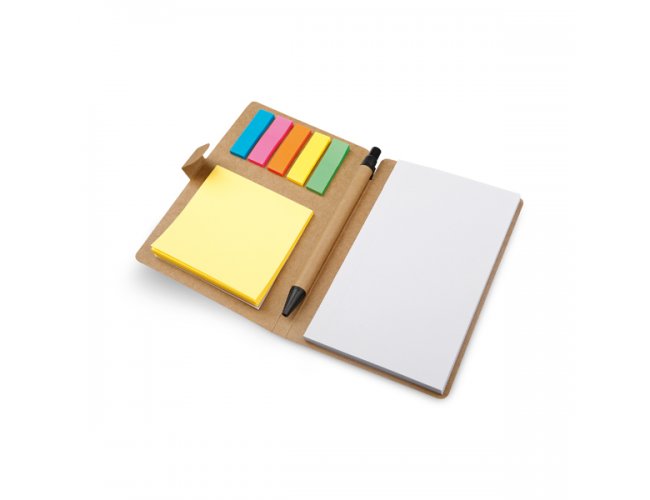 6 blocos adesivados com 25 folhas cada e capa em papel kraft reciclado. Incluso caderno com 100 páginas lisas e esferográfica em papel kraft reciclado, com escrita em azul. A capa e as notas adesivas são feitos de papel proveniente de gestão florestal sustentável.