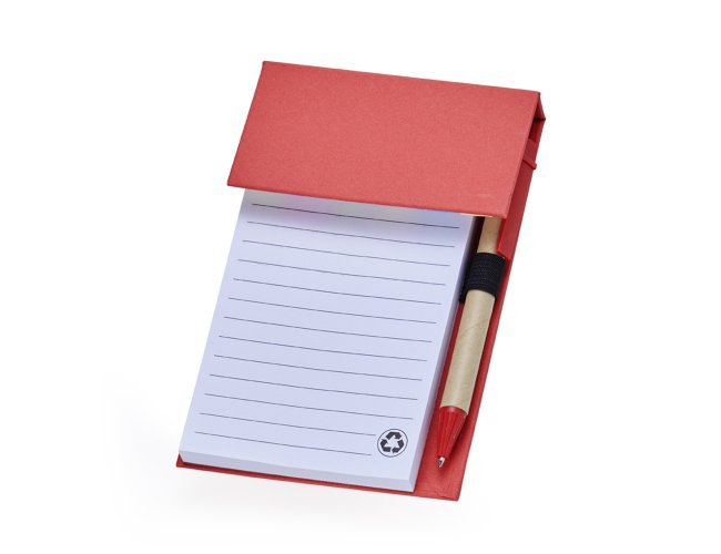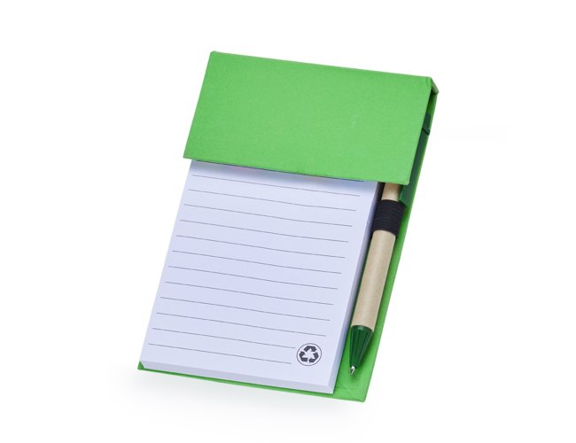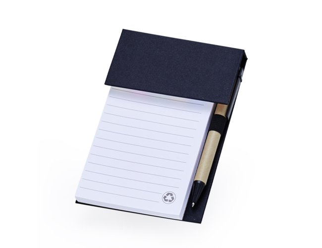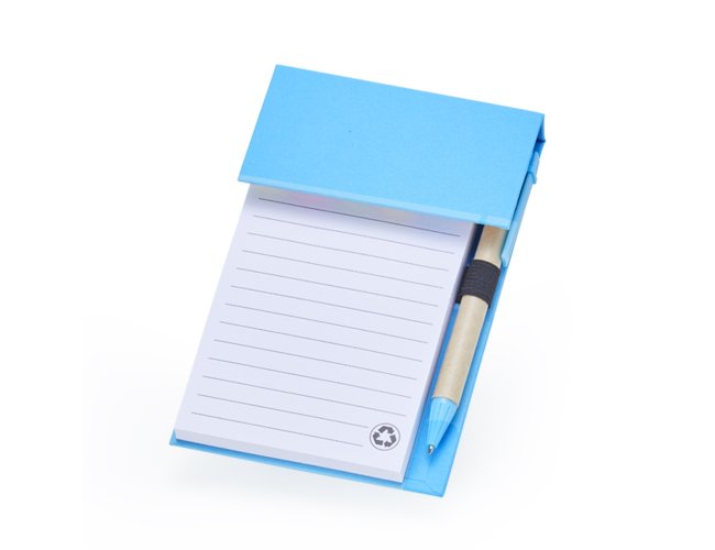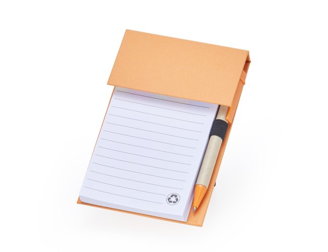Bloco de anotações ecológico com caneta, feito em kraft com 6 blocos autoadesivos coloridos com aproximadamente 20 folhas e bloco com aproximadamente 100 folhas brancas com pauta. Possui porta caneta elástico e acompanha caneta de papelão e detalhes plásticos, carga esferográfica azul 1.0mm e acionamento por clique.
