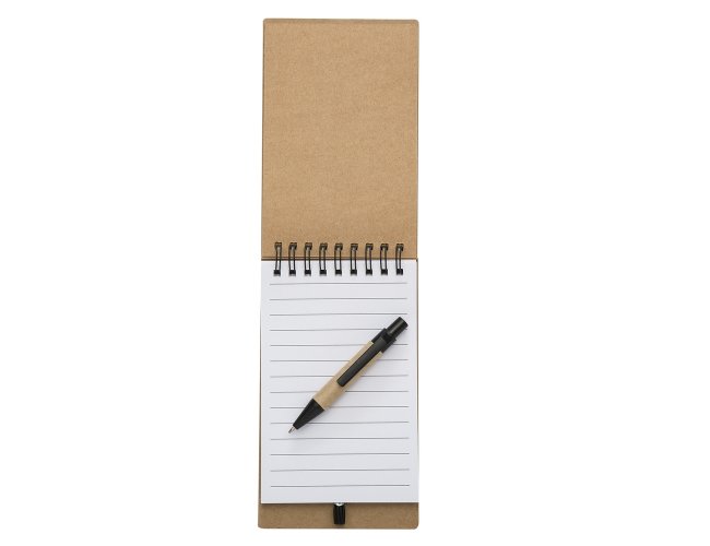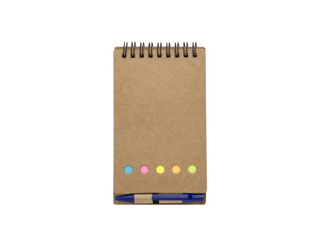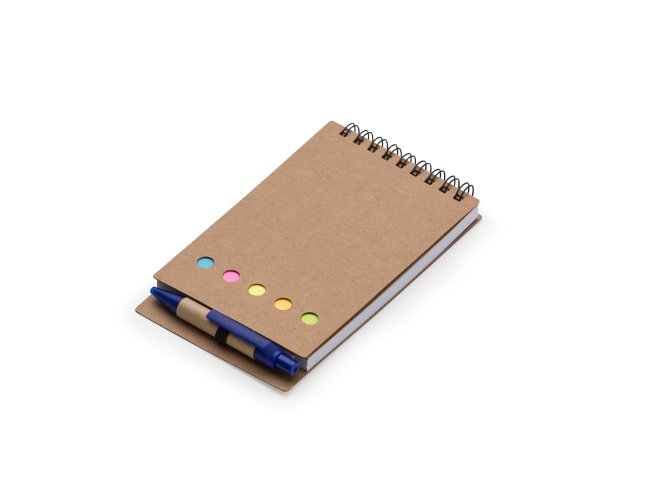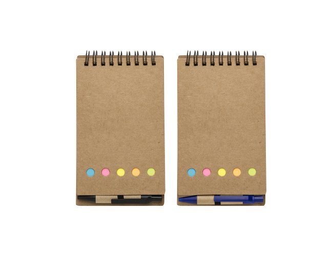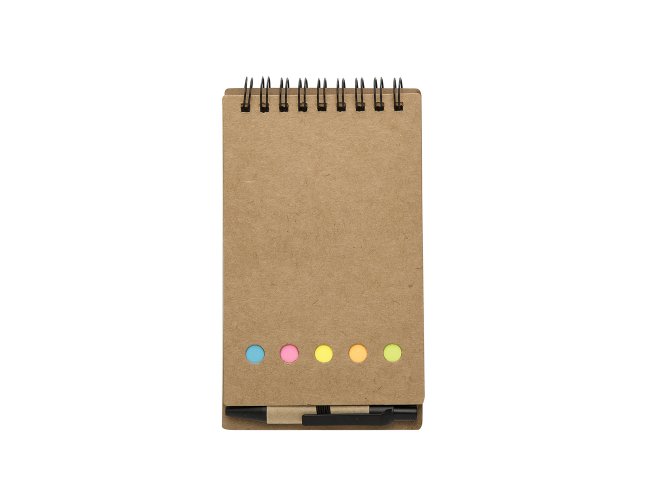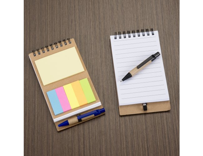 Bloco de anotações ecológico com autoadesivos e mini caneta.