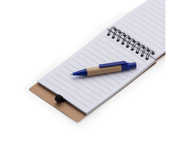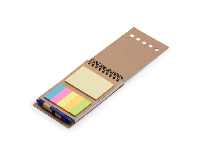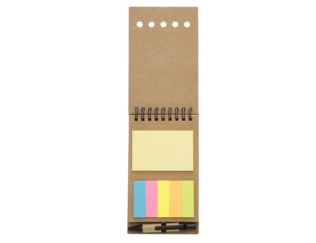 Bloco de anotações ecológico com autoadesivos e mini caneta. Bloco com wire-o e detalhes vazados na capa, contém conjunto de cinco bloquinhos autoadesivos coloridos, bloco autoadesivo pequeno, miolo com folhas pautadas e suporte de nylon com mini caneta de papelão com carga esferográfica na cor azul e acionamento por clique.