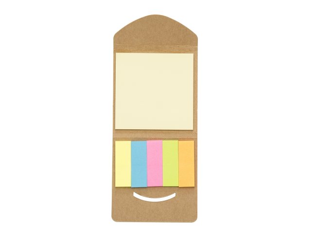 Mini bloco ecológico formato envelope com autoadesivos e capa com detalhes vazados. Contém bloco pequeno e conjunto com cinco bloquinhos autoadesivos coloridos.