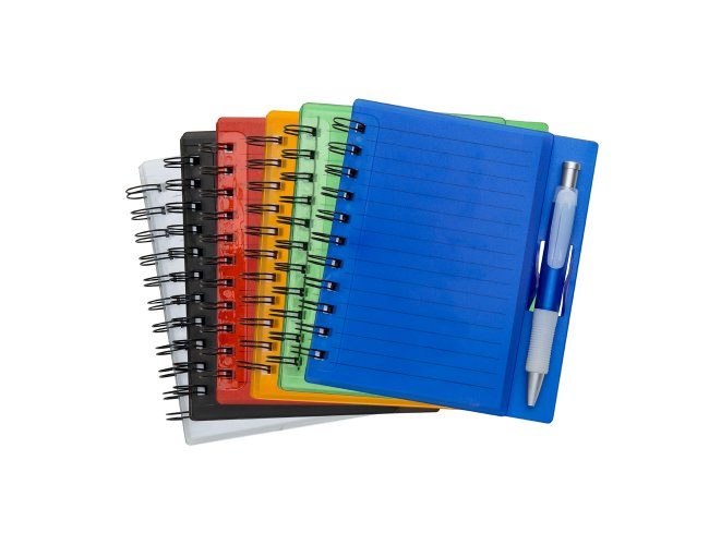 Caderno plástico wire-o com caneta e suporte para encaixe. Caneta plástica com detalhe emborrachado, carga esferográfica na cor azul e acionamento por clique.
