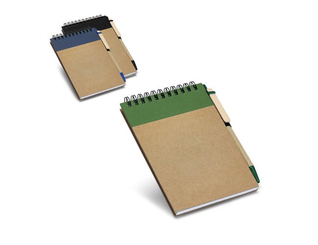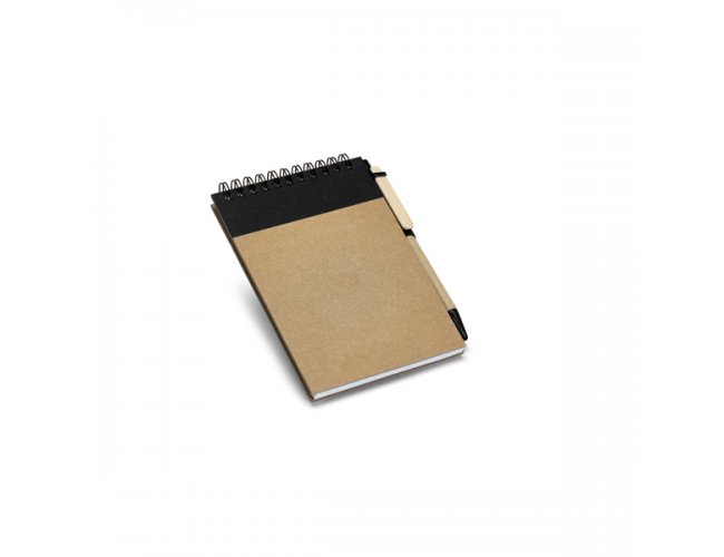 Caderno de bolso espiral de capa dura em cartão. Contém 120 páginas lisas em papel 100% reciclado e suporte para esferográfica (inclusa). Esferográfica com escrita em azul. 105 x 145 mm