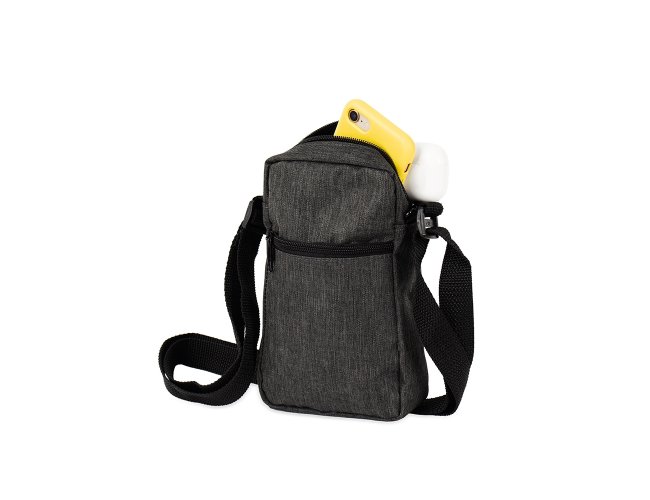 Bolsa de ombro resistente à água, confeccionada em poliéster mesclado com PVC, com fechamento em zíper e alça ajustável. Possui divisória em tela de nylon no compartimento interno e um bolso frontal para a organização de objetos.