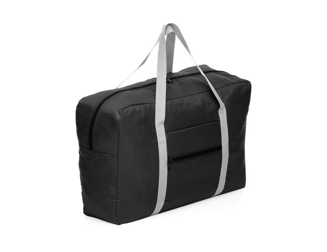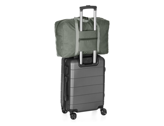 Bolsa de viagem dobrável 32 litros em poliéster impermeável com dois compartimentos. Contém bolso para encaixe em malas de viagem.