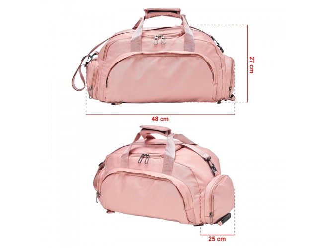 Bolsa esportiva com capacidade de até 28 litros em poliéster resistente à água com cinco compartimentos, incluindo espaço exclusivos para tênis, itens molhados e para o armazenamento da alça de costas, o que permite utilizá-la como mochila. Possui ainda alça transversal removível, alças de mãos com suporte de juntura.