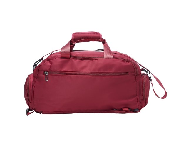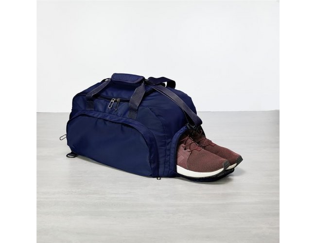 Bolsa esportiva com capacidade de até 28 litros em poliéster resistente à água com cinco compartimentos, incluindo espaço exclusivos para tênis, itens molhados e para o armazenamento da alça de costas, o que permite utilizá-la como mochila. Possui ainda alça transversal removível, alças de mãos com suporte de juntura.