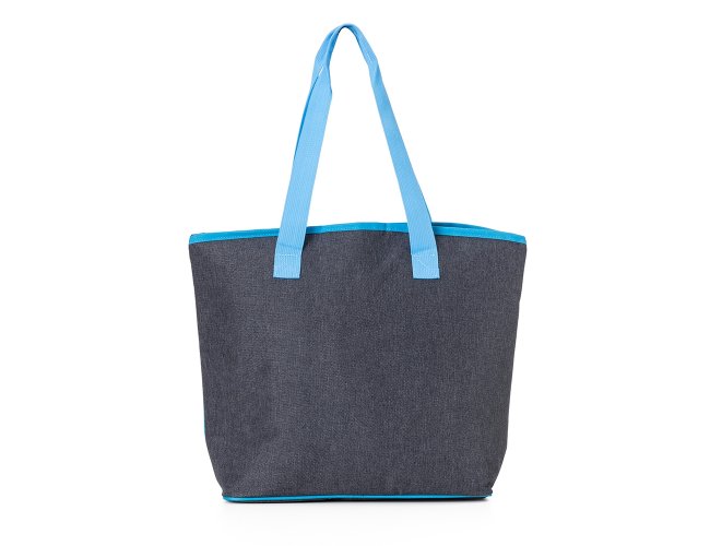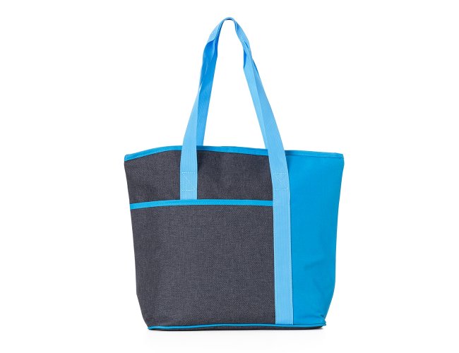 Bolsa térmica de poliéster com capacidade de 15 litros, contém área interna com revestimento PEVA, bolso frontal externo e alças de mãos para transporte.