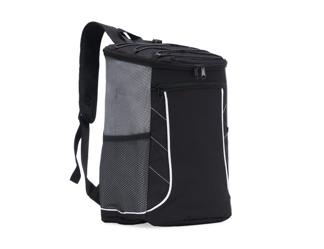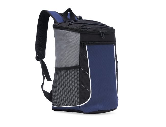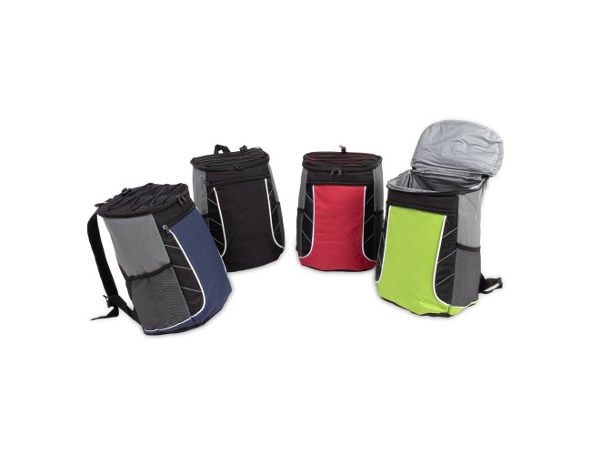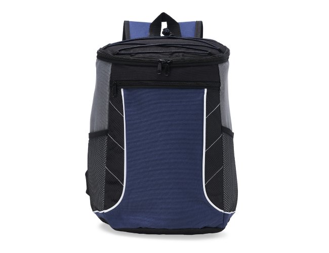 Descrição: Bolsa térmica de poliéster com dois compartimentos, capacidade de 18 litros. A bolsa possui revestimento térmico em PEVA atóxico, bolsos laterais telados, alça de mão e alça para as costas com revestimento espumado.