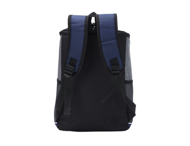 Bolsa térmica de poliéster com dois compartimentos, capacidade de 18 litros. A bolsa possui revestimento térmico em PEVA atóxico, bolsos laterais telados, alça de mão e alça para as costas com revestimento espumado.