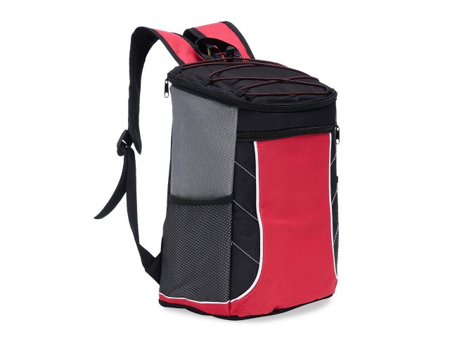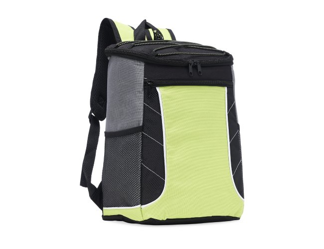 Descrição: Bolsa térmica de poliéster com dois compartimentos, capacidade de 18 litros. A bolsa possui revestimento térmico em PEVA atóxico, bolsos laterais telados, alça de mão e alça para as costas com revestimento espumado.