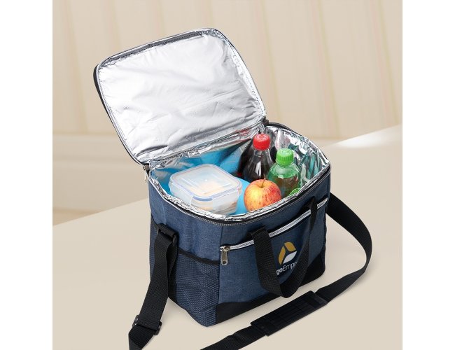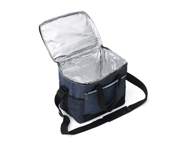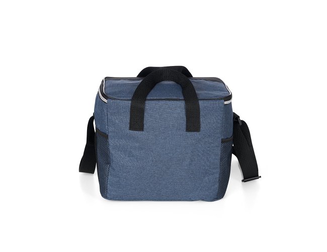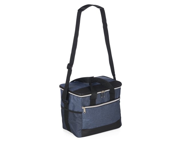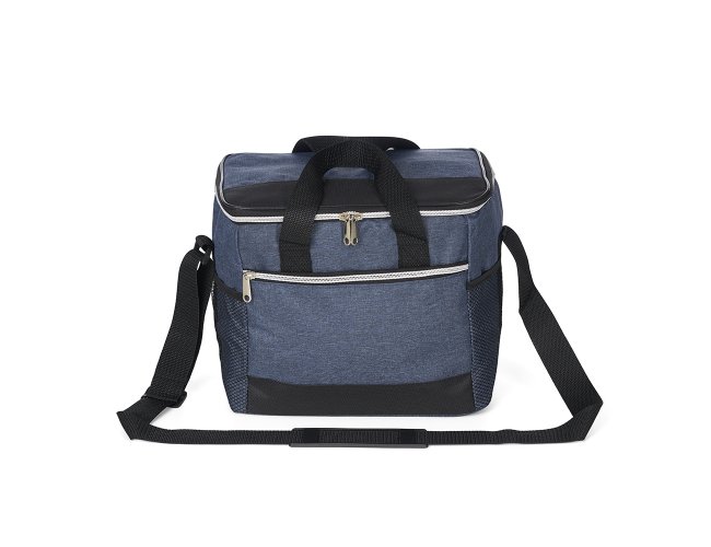 Bolsa térmica 18 litros. Contém bolso frontal com zíper, bolsos laterais telados, alça de mão em nylon e alça transversal regulável (não removível) com apoio para ombro.
