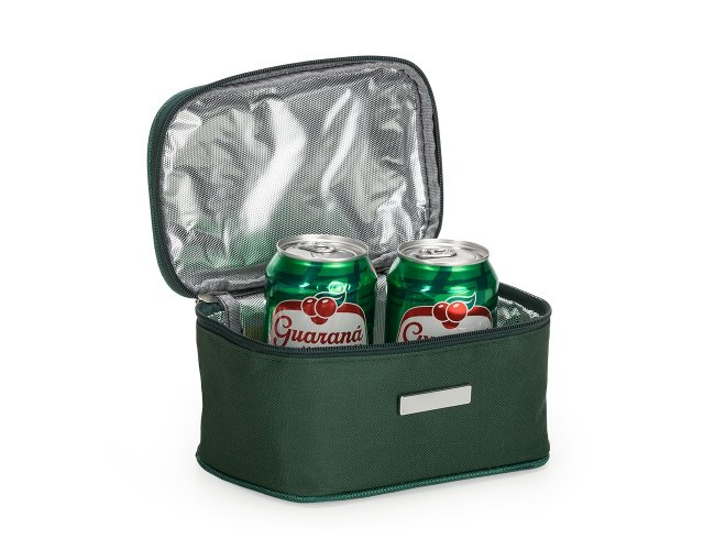 Bolsa térmica 2,6 litros em nylon com alça para mão, parte interna com revestimento térmico e acompanha plaquinha para personalização avulsa.