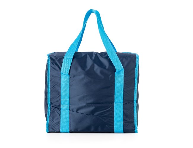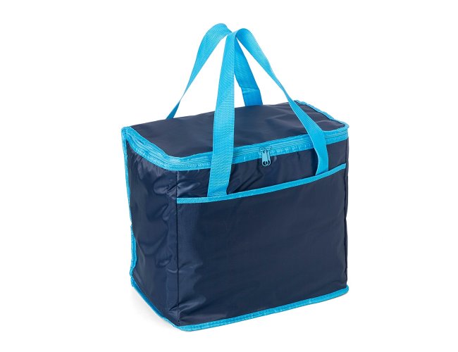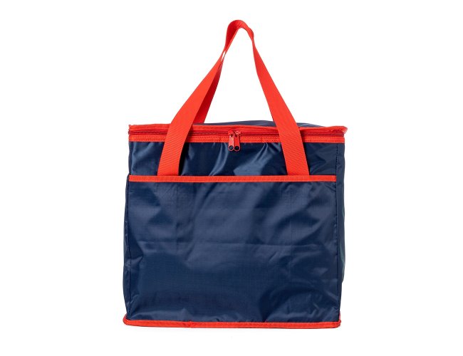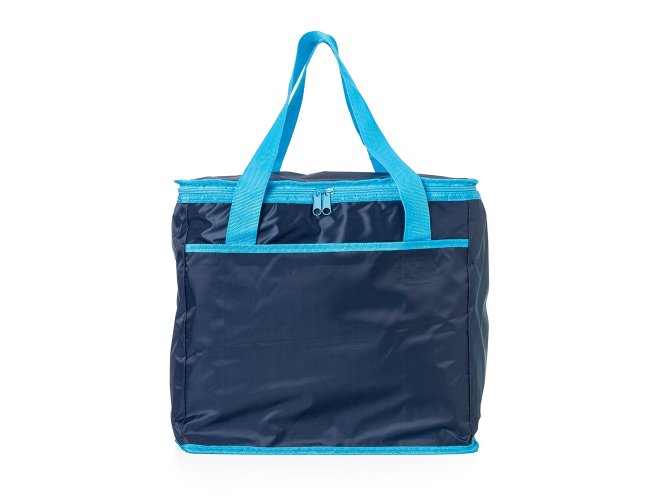 Bolsa térmica de poliéster com capacidade de 33 litros, contém área interna com revestimento térmico aluminizado, bolso frontal externo e alças de mãos para transporte.