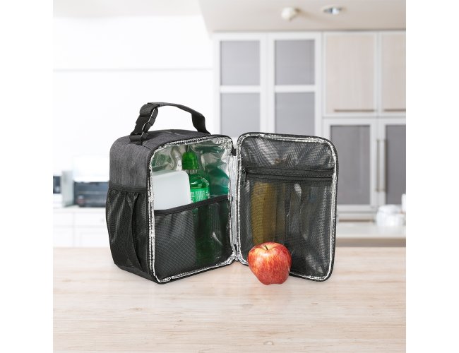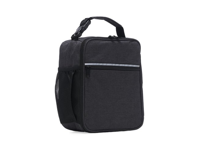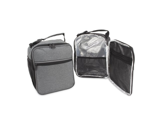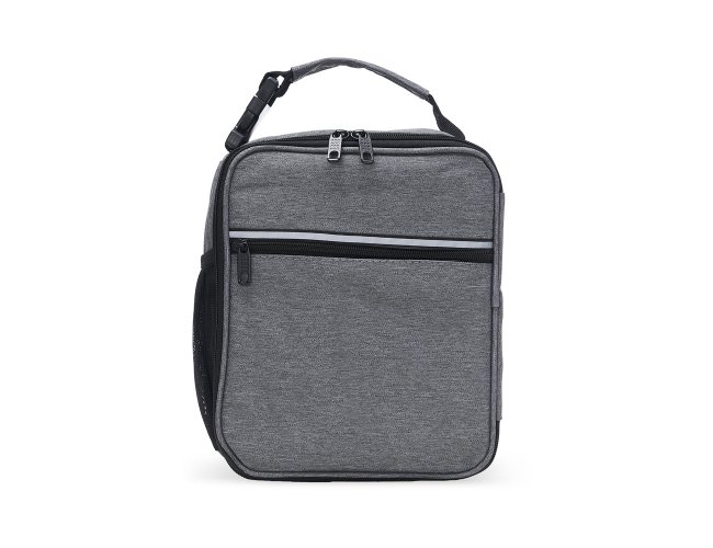 Descrição: Bolsa térmica de nylon com dois compartimentos, capacidade de 6 litros. Com bolso telado e tela média de proteção interna, a bolsa possui uma faixa frontal refletiva, bolso lateral telado e alça de mão com fivela de encaixe.