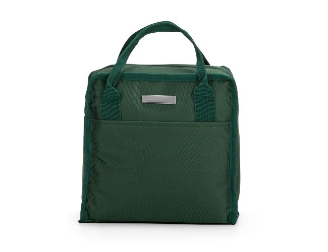 Bolsa térmica 7 litros em nylon com dois bolsos externos nas laterais, alça para mãos e revestimento interno térmico. Acompanha plaquinha para personalização avulsa.