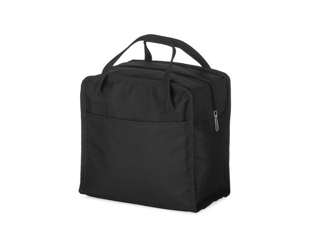 Bolsa térmica 7 litros em nylon com dois bolsos externos nas laterais, alça para mãos e revestimento interno térmico. Acompanha plaquinha para personalização avulsa.