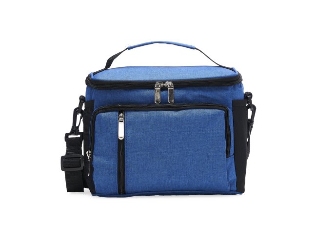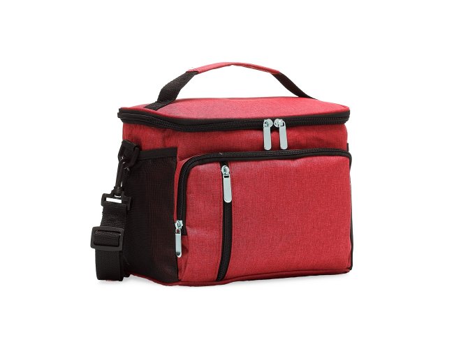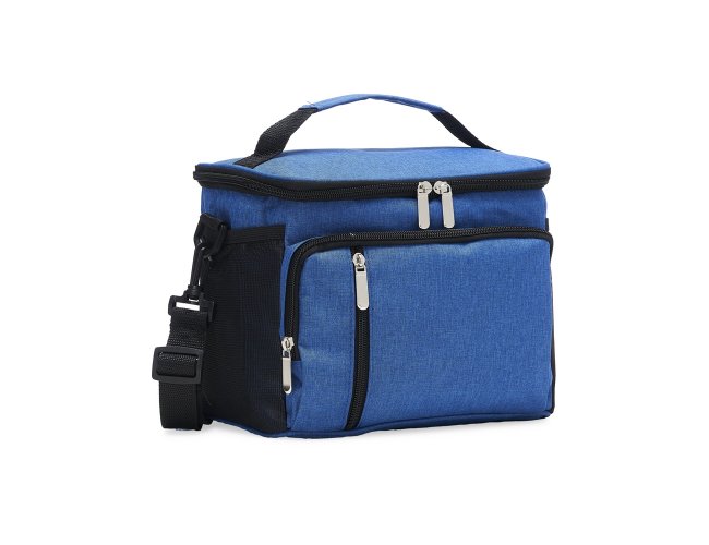 Descrição: Bolsa térmica de poliéster com três compartimentos, capacidade de 9 litros. A bolsa possui revestimento térmico em PEVA atóxico com costura soldada (não vaza), alça de mão, bolsos laterais telados e acompanha alça transversal.