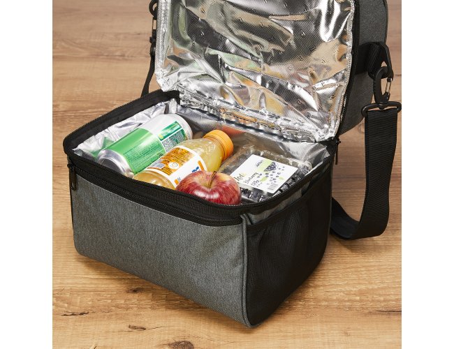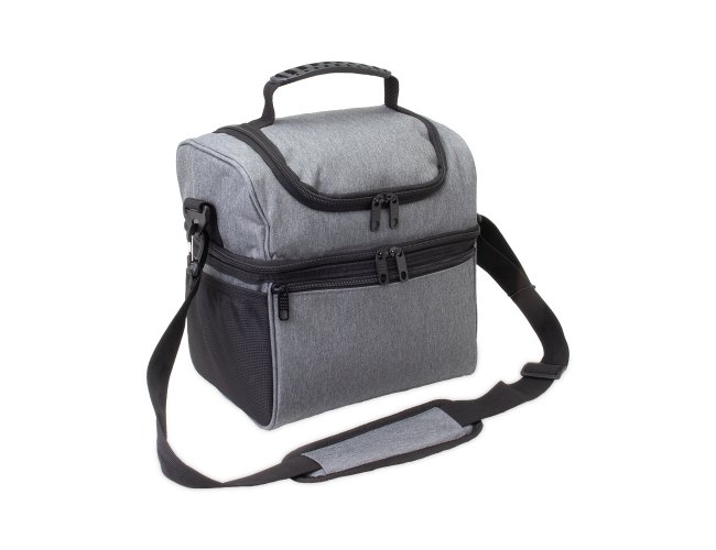 Bolsa térmica dupla de nylon com três compartimentos, capacidade de 16 litros. Contém dois compartimentos térmicos isolados, sendo o principal com costura soldada (não vaza). A bolsa possui alça de mão com pegador plástico, bolsos laterais em malha e acompanha alça transversal.