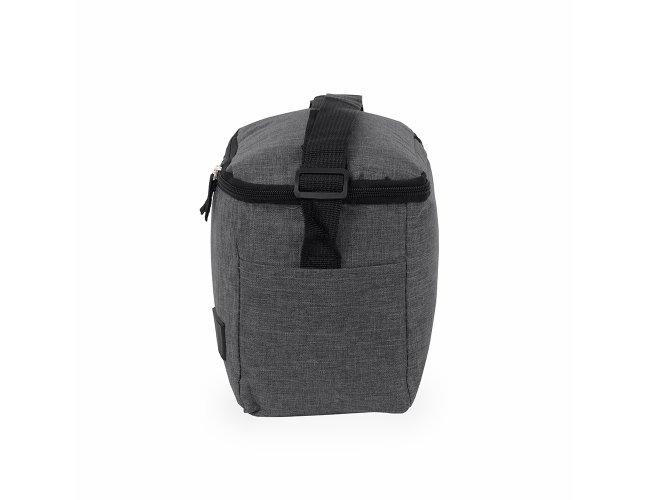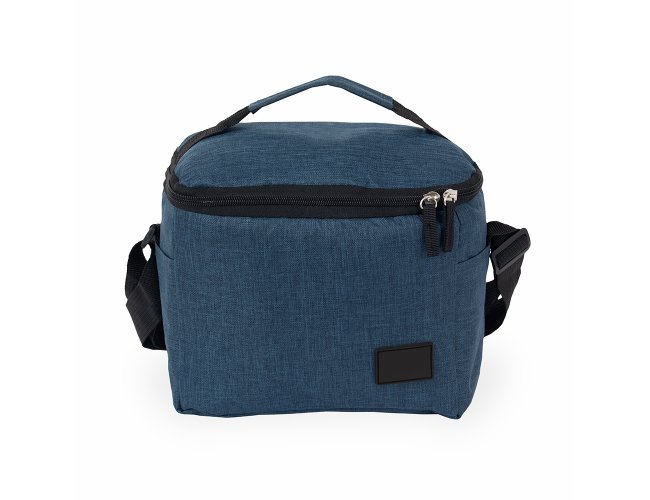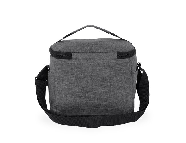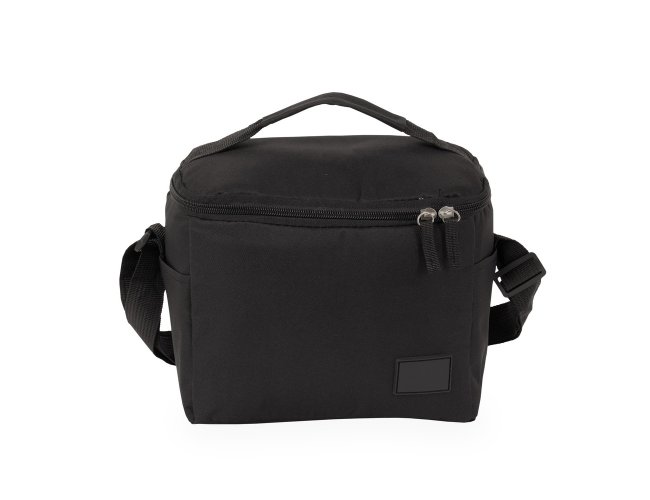 Bolsa térmica confeccionada em Oxford 300D resistente à água com capacidade máxima de 6 litros, fechamento em zíper e plaquinha personalizável em plástico costurada na parte frontal. Possui revestimento térmico antivazamento em PEVA, dois bolsos laterais, alça de mão superior e alça transversal ajustável.