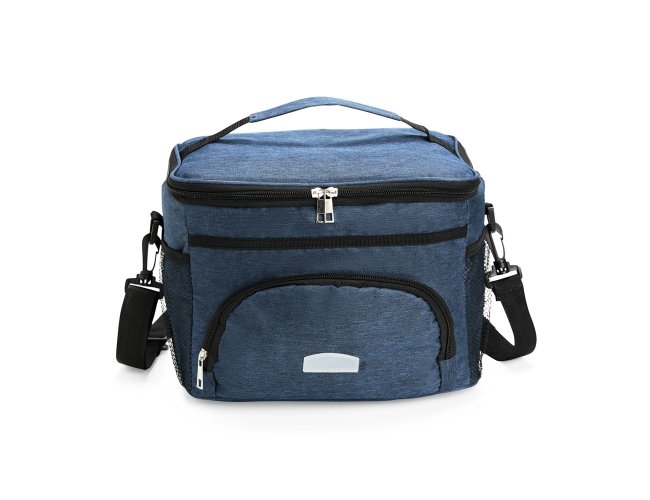 Bolsa térmica confeccionada em poliéster resistente à água e capacidade de até 10 litros. Possui revestimento térmico interno em PVC laminado, dois bolsos laterais em tela, bolso frontal com zíper e plaquinha em PVC, além de duas alças: uma superior fixa e outra transversal removível.