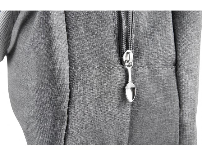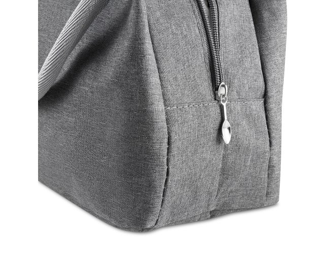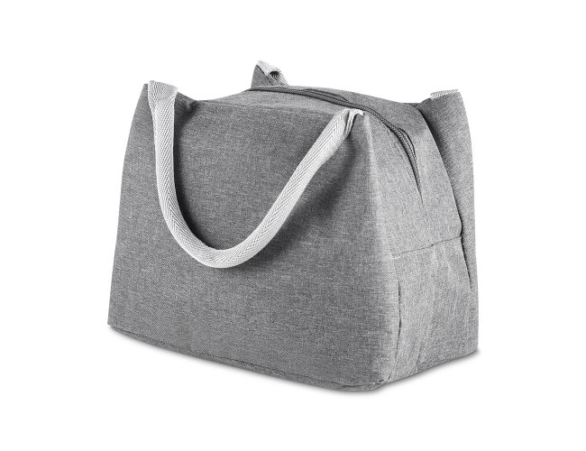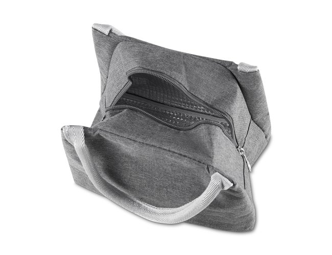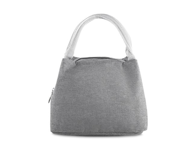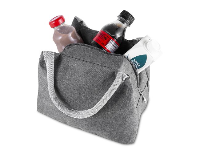 Bolsa térmica com alça de mão, confeccionada em poliéster 300D na parte externa e alumínio com manta térmica no interior. Modelo costurado, puxador de zíper em formato de colher, sem solda e capacidade para 5,6 litros.