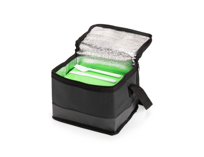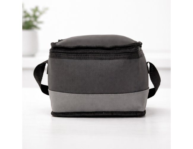 Bolsa térmica resistente à água confeccionada em poliéster e PVC, fechamento em zíper e capacidade máxima de 5 litros. Conta com revestimento térmico em espuma EPE e alça superior em nylon para transporte.