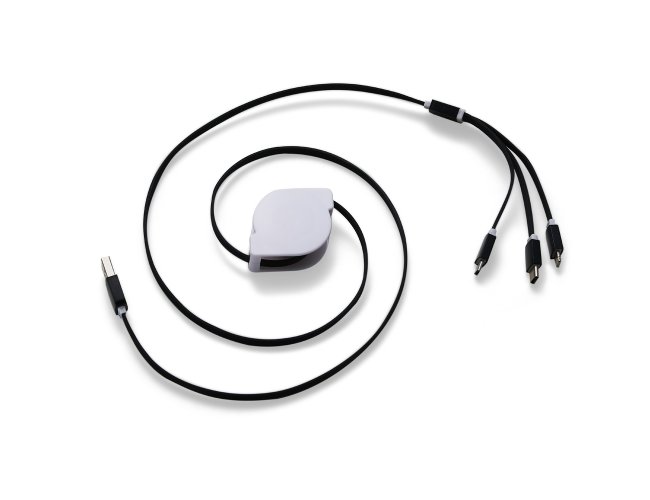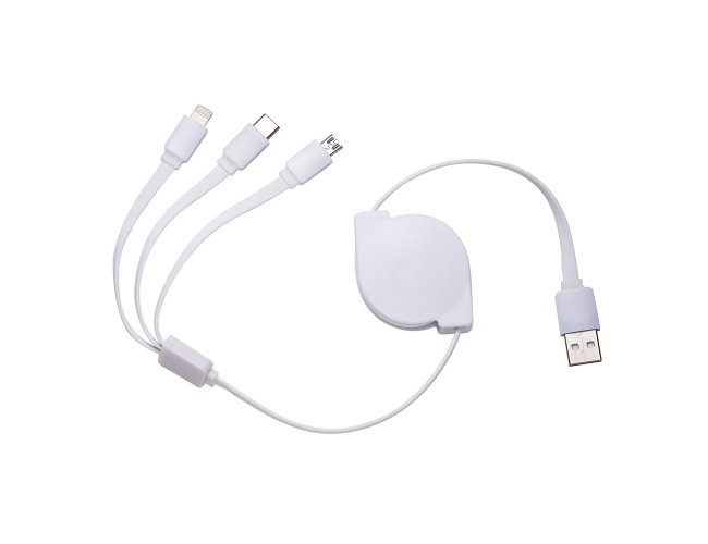 Cabo USB retrátil 3 em 1 (não transfere arquivos). Entrada Lightning: Iphone, Ipad e Ipod; Entrada Micro USB: smartphones e tablets Android; Entrada Micro USB-C: modelos mais recentes de smartphones e tablets Android. Suporte plástico branco de frente lisa e verso com detalhe oval (com parafuso no centro). Possui rolamento com trava automática, os dois lados de cabo devem ser puxados simultaneamente e ao soltar irão travar. Não puxar um cabo por vez para não embolar.