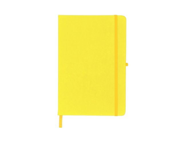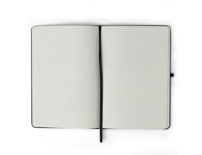 Caderneta emborrachada com porta caneta elástico em nylon, marcador de página em cetim e fita elástica de nylon para fechar. Contém aproximadamente 80 folhas pardas sem pauta.