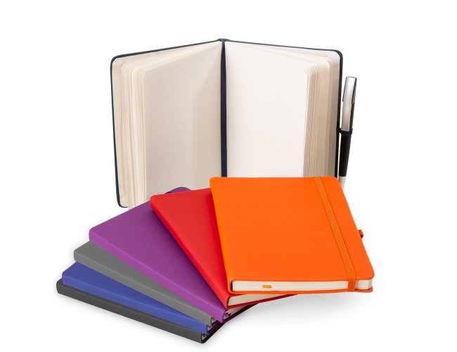 Caderneta emborrachada com porta caneta em nylon, marcador de página em cetim e fita elástica para lacre. Contém aproximadamente 80 folhas pardas sem pauta. OBS.: PEDIDOS MÚLTIPLOS DE 5 PEÇAS!