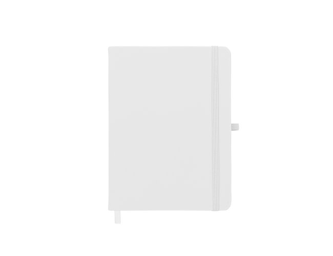 Caderneta emborrachada com porta caneta em nylon, marcador de página em cetim e fita elástica para lacre. Contém aproximadamente 80 folhas pardas sem pauta.
