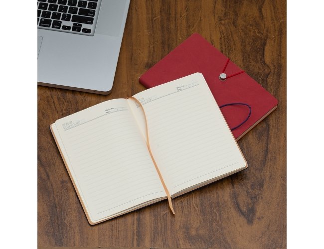 Caderneta com fecho de pino e elástico de nylon para lacre. Capa em material sintético emborrachado, possui aproximadamente 96 folhas pardas pautadas e marca página em cetim.