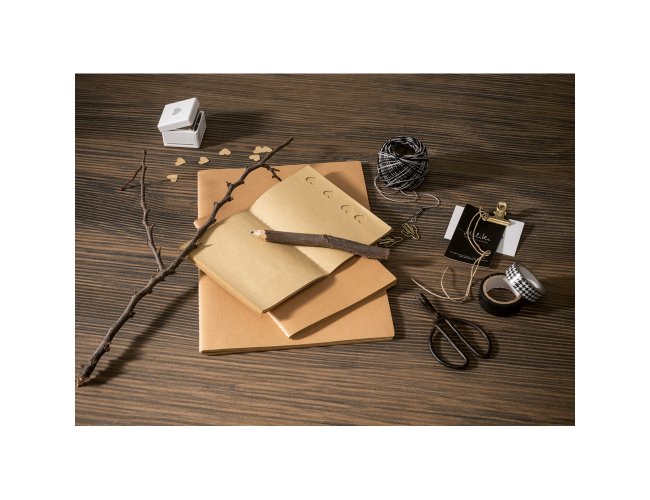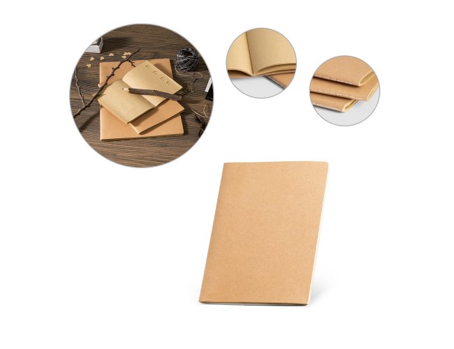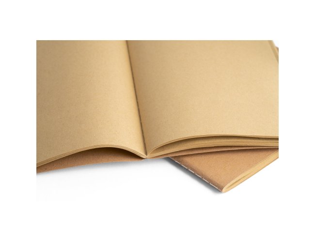 Caderno A5 de capa flexível em cartão (250 g/m²) e cantos redondos. Contém 80 páginas lisas, costuradas, proveniente de gestão florestal sustentável.
