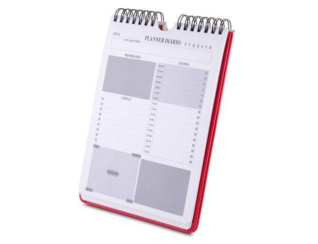 Caderno Planner com capa em PU 2 mm, 90 folhas 95 g/m², páginas para preenchimento diário, incluindo seções de prioridades, agenda do dia, tarefas e horários para refeições.