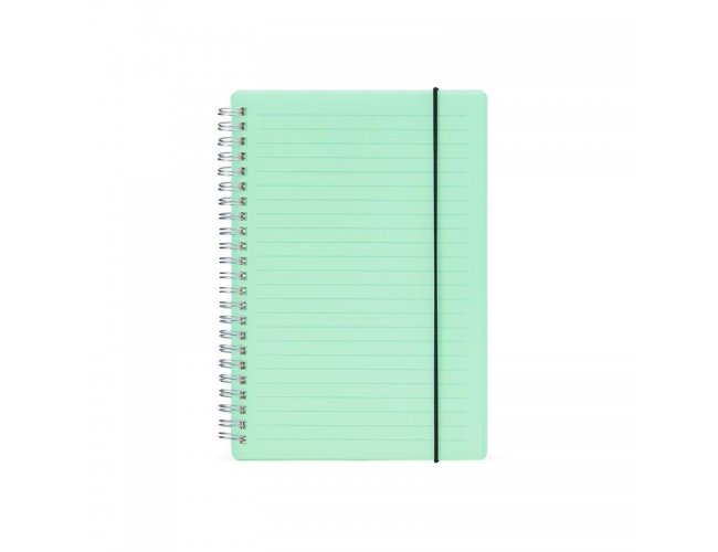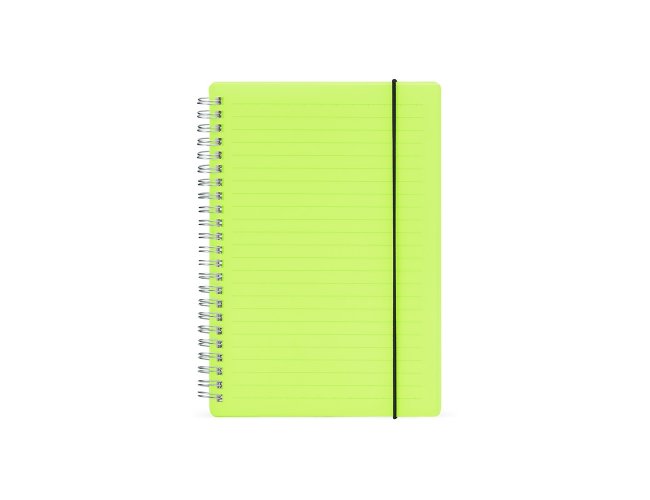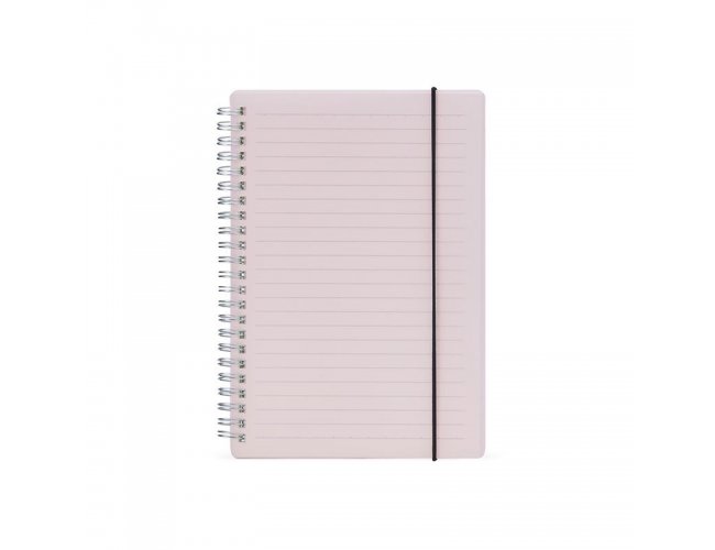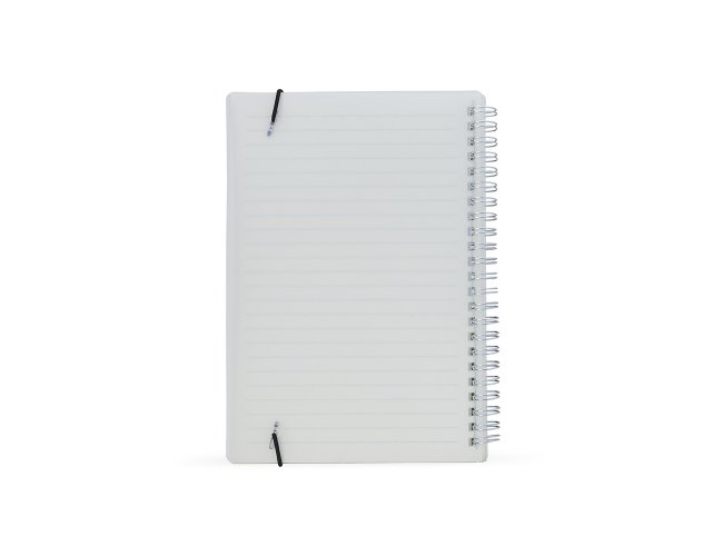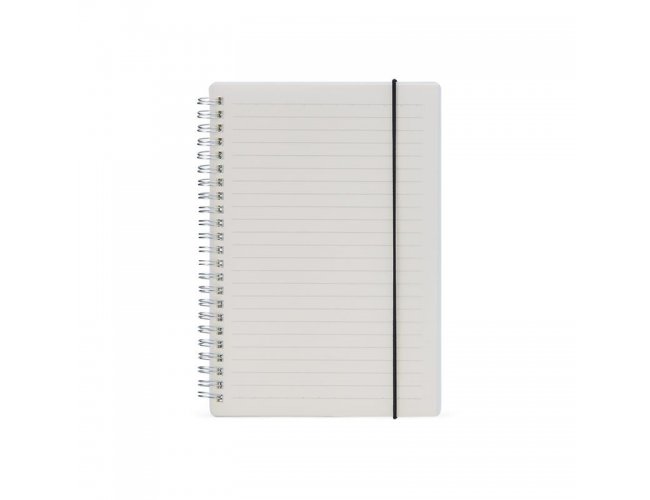 Caderno A5 com capa plástica e elástico para lacre, contém aproximadamente 80 folhas marfim com pauta.