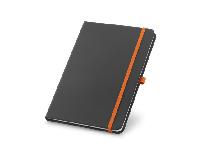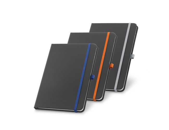 Caderno A6 de capa dura em c. sintético. Contém 160 páginas pautadas, fita separadora, elástico e suporte para esferográfica (não inclusa). 90 x 140 mm