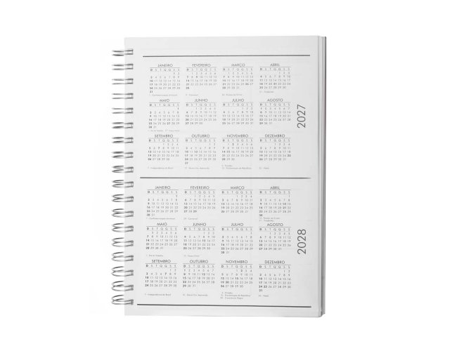 Contém folha de dados pessoais, folha com calendários  de 2025 à 2028 e espaço para anotações mensais.