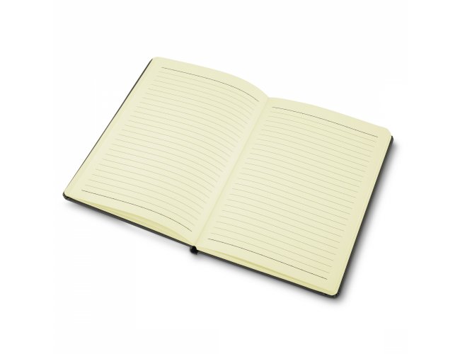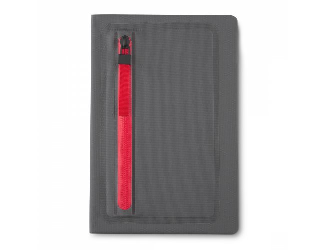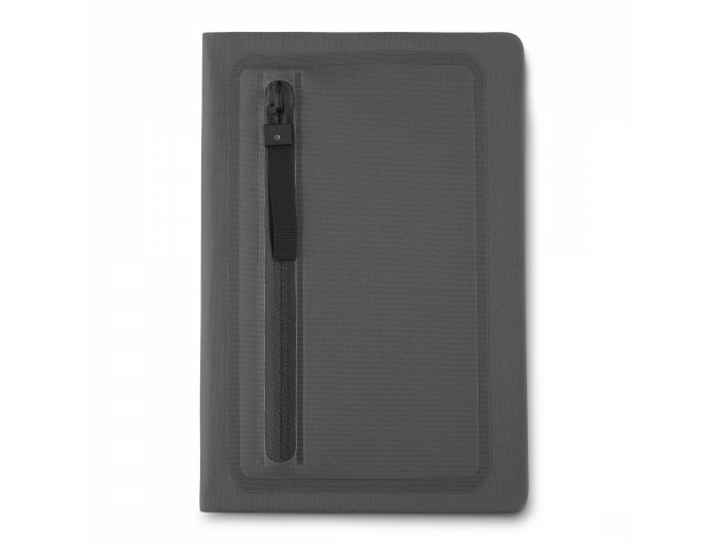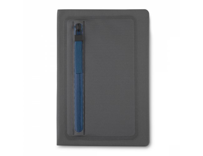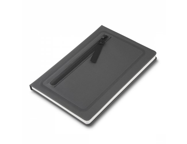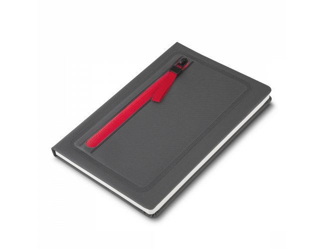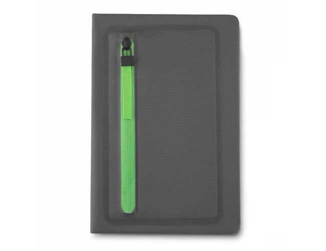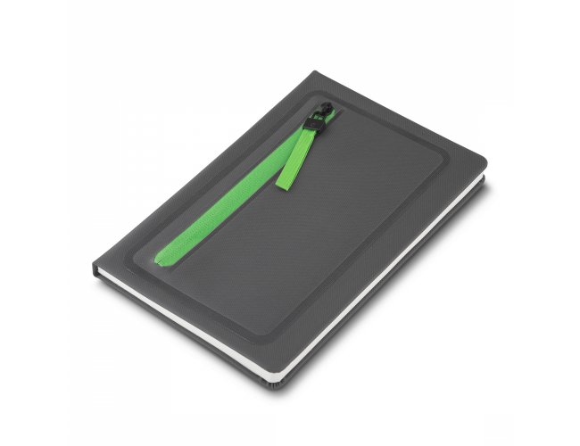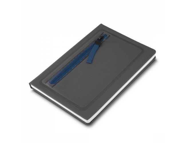 Caderno de anotações com porta objetos na capa, capa dura em material sintetico, miolo 80 folhas pautadas na cor bege.