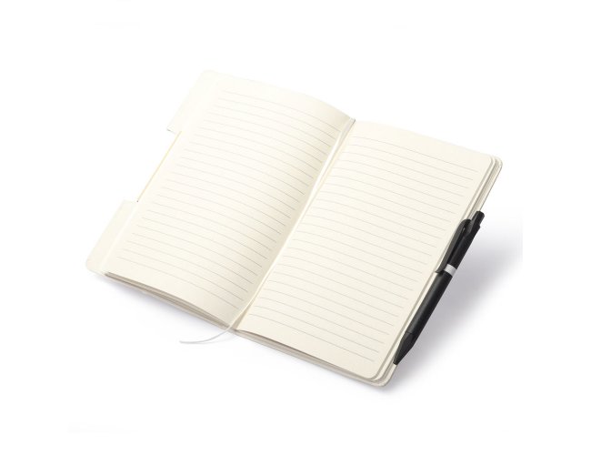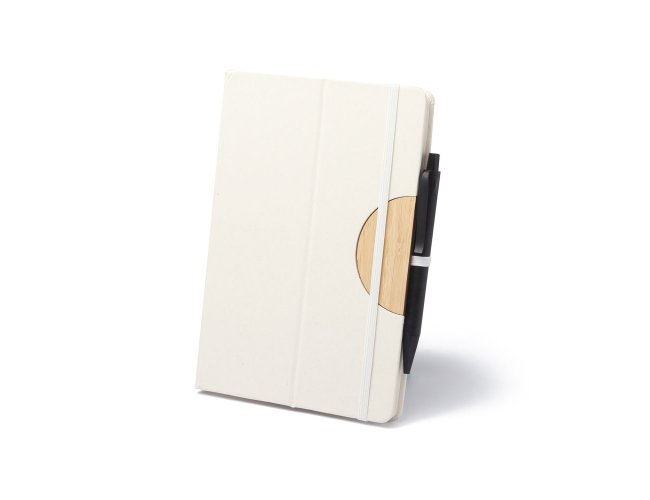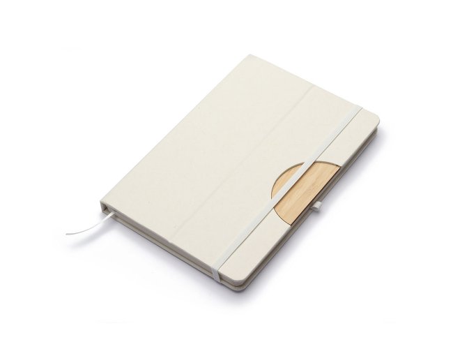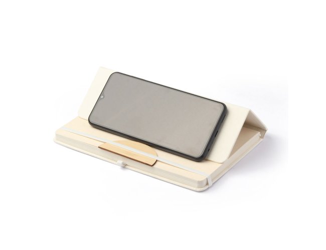Caderno com tampa de função de suporte para smartphone. Produzido com caixa de leite, possui guarnições em bambu, porta canetas e elástico branco com 80 folhas(g/m2)pautadas na cor bege.