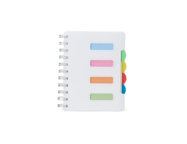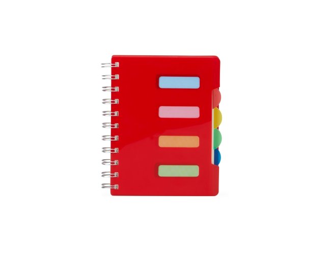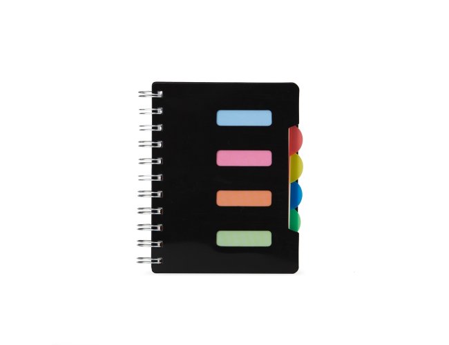 Caderno pequeno com 4 divisórias e abas para identificações, capa plástica com wire-o metálico.