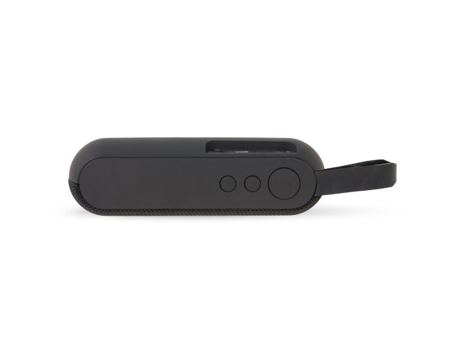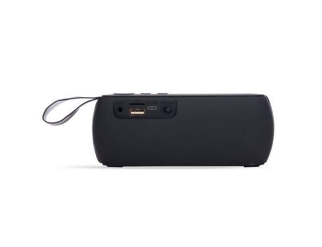 Caixa de som multimídia com estrutura em plástico, acabamento nos falantes em malha, parte inferior com borrachas antiderrapantes e alça lateral para transporte. Conta com painel de botões na parte superior, conexão Bluetooth 4.2, rádio FM e entradas para cabo auxiliar P2, cabo Micro-USB, cartão TF (microSD) e USB para pen drives que permitem a reprodução de arquivos MP3. Acompanha cabo Micro-USB.