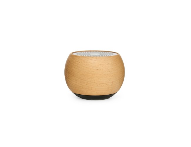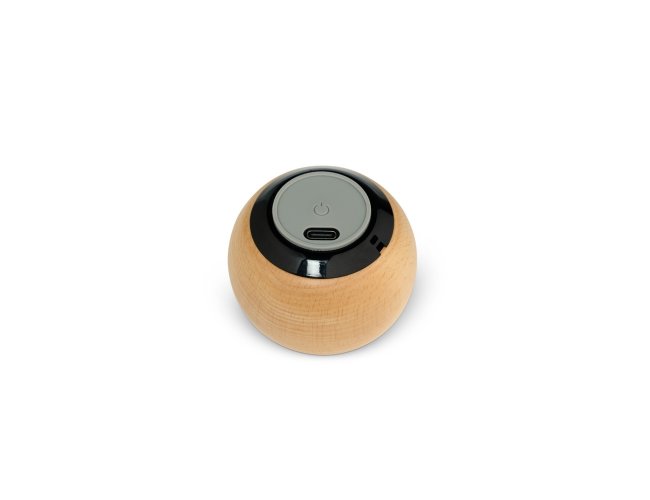 Caixa de som sem fio com estrutura em madeira e inox, além de base em material antiderrapante. Possui entrada USB-C para carregamento, conexão Bluetooth e compatibilidade com a tecnologia TWS, que permite sincronizar duas caixas de som ao mesmo tempo. Acompanha USB-C.