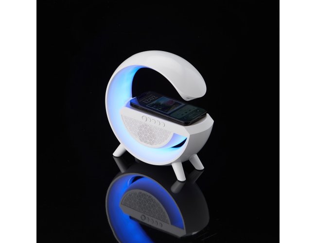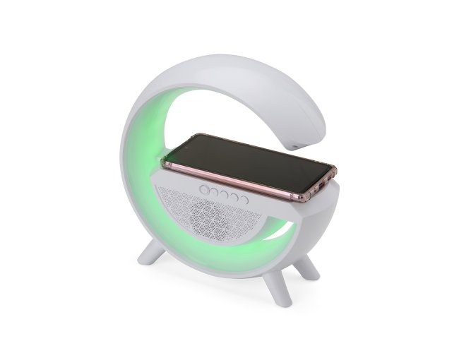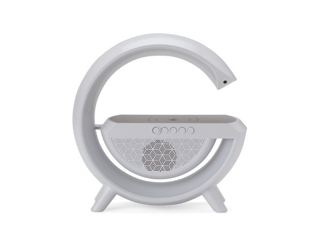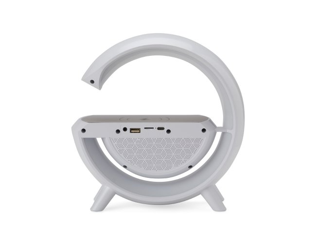 Caixa de som multimídia com estrutura em plástico, iluminação em LED ajustável e espaço para carregamento de dispositivos por indução. Possui conectividade Bluetooth 5.2 e rádio FM, além de entradas auxiliar P2, USB-C, USB-A e TF, possibilitando a reprodução de arquivos MP3 a partir de pen drives e cartões microSD. Acompanha cabo USB-C para recarga da caixa.