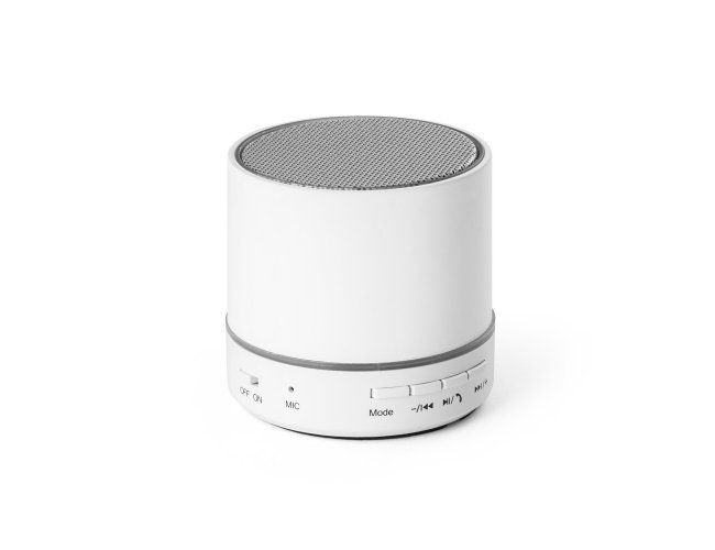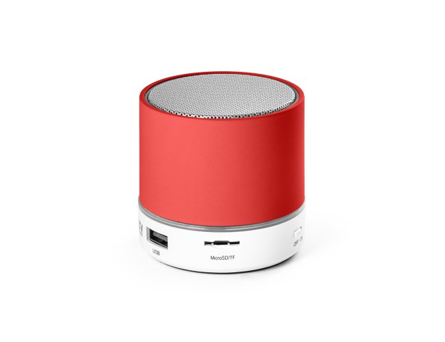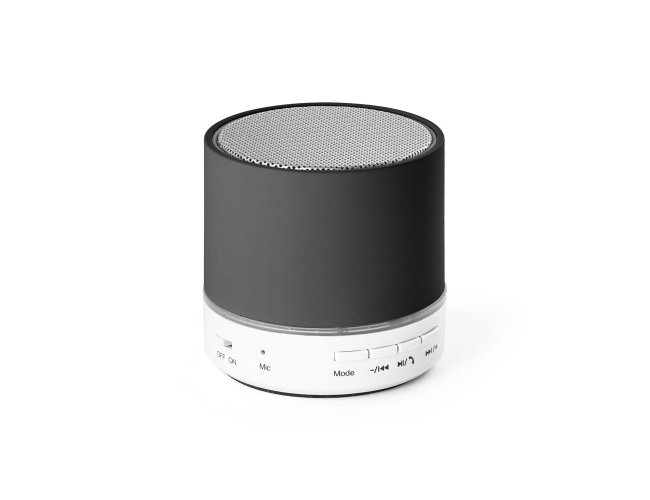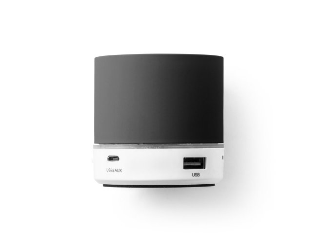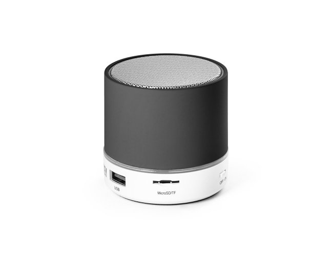 Caixa de som portátil com microfone, em ABS e acabamento emborrachado. Transmissão sem fios BT v3.0 e leitor de cartões TF. Com 3W/4Ω e autonomia aproximada de 2h. Função para atender chamadas, controle de volume e conexão à playlist do dispositivo móvel. Incluso cabo USB / micro USB para carregar. ø59 x 55 mm