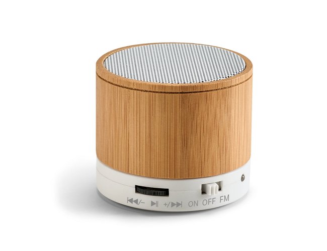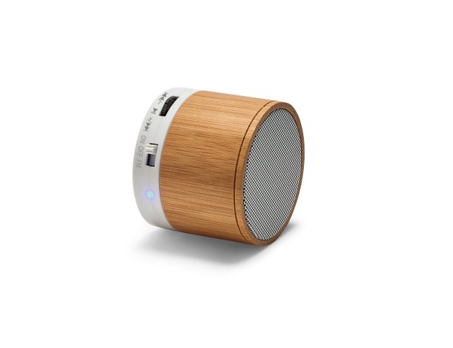 Caixa de som com microfone em bambu. transmissão sem fios BT v3.0, ligação stereo 3,5 mm e leitor de cartões TF e potência de 3W (4Ω). Bateria com capacidade até 300 mAh e autonomia aproximada de 3 horas. Função para atender chamadas, controle de volume, conexão à playlist do dispositivo móvel e rádio FM. Incluso cabo USB / micro USB para carregar e cabo de áudio (Jack/Jack). Fornecida em caixa presente de papel kraft. ø60 x 52 mm
