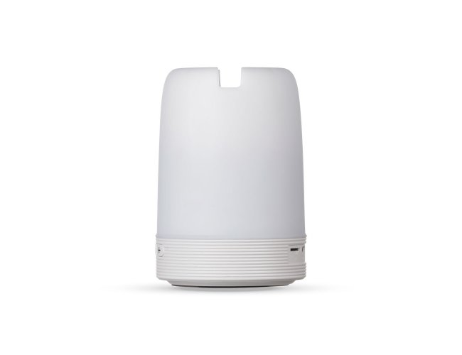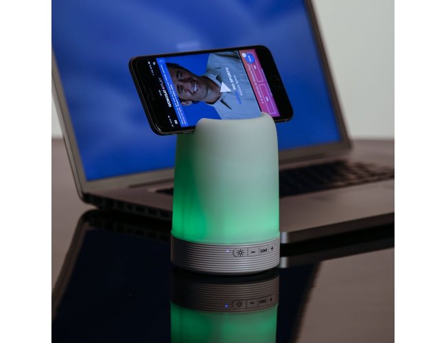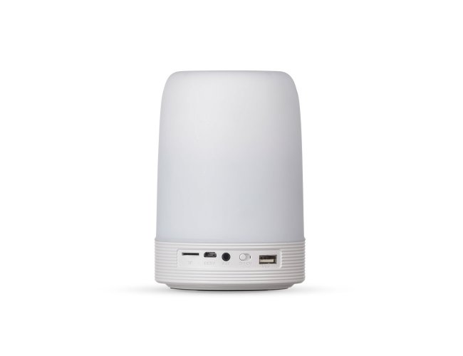 Caixa de som multimídia com luzes, suporte para celular e porta caneta. Material plástico resistente na cor branca fosca, parte superior com falante vazado na área interna, pode ser utilizado como porta caneta ou suporte para celular. Parte inferior branca leitosa com linhas em relevo, borracha inferior anti deslizante e alça de alumínio.