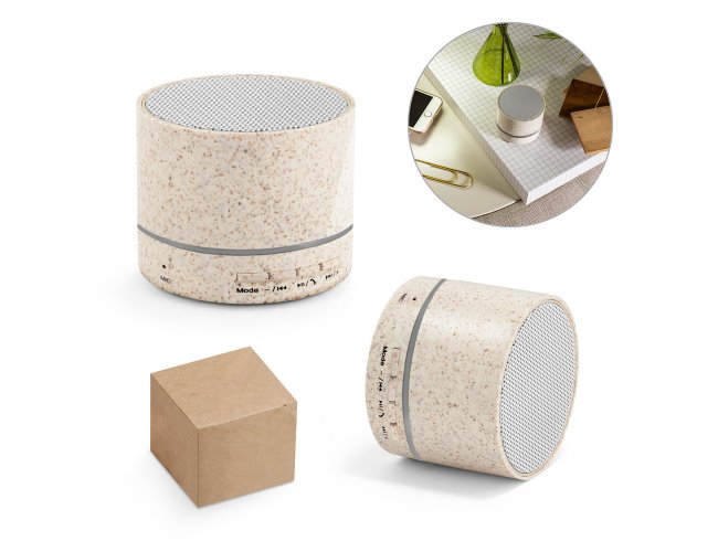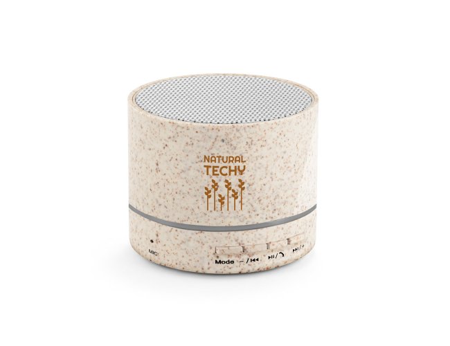 Caixa de som portátil com microfone, em fibra de palha de trigo e ABS 100% reciclado, com transmissão sem fios BT 5.3. Tem potência de 3W, bateria com 400 mAh e autonomia, aproximada, de 4h30. Permite ainda as funções de atender chamadas, leitor de cartões microSD, entrada AUX e reprodução automática via porta USB-A. Incluso cabo de carregamento USB. Fornecido em caixa presente de papel kraft reciclado que pode ser reutilizada como suporte de celular. A grelha é fornecida solta para pedidos não personalizados. A cor e o resultado da impressão nos materiais naturais pode variar entre produtos. ø62 x 48 mm
